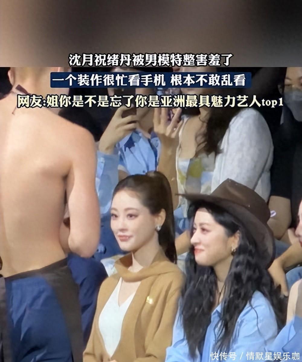 而祝绪丹则完全是另一种画风:她当天穿了一身简约干练的黑色套装,头发利落地挽起来,整个人透着冷冽的高级感。面对半裸男模,她全程保持着从容的姿态,眼神平静地看着秀台,偶尔还会和身边人轻声交流两句,丝毫没有露出尴尬或害羞的神情,跟沈月形成了鲜明对比。这段视频传到网上后,评论区直接被网友的笑声淹没:“沈月也太真实了吧!这不就是我看到帅哥的反应吗?”“祝绪丹好淡定啊,姐姐气场绝了,我要是在现场,估计比沈月还夸张”“两个人的反差也太萌了,一个像社恐本人,一个像社牛代表,能不能一起上个综艺啊”;还有粉丝调侃沈月:“月月,咱下次见帅哥能不能淡定点儿,好歹也是见过大场面的女明星啦!”